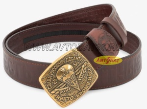 Внешняя сторона кожаного ремня, методом горячего тиснения, украшена словами: "Нет задач невыполнимых - есть десантные войска!" и изображением славного Русского оружия. На внутренней стороне нанесён полный текст Гимна Русских Десантников "Расплескалась синева, расплескалась...", который звучит в сердце каждого нашего Воина!