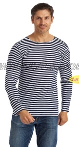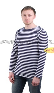 Летняя тельняшка-флотская нательная фуфайка с длинными рукавами и темно-синими полосками.