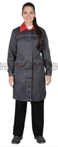 Халат с центральной потайной застёжкой на 5шт. обметанных петель и 5шт. пуговиц; с воротником пиджачного типа; с левым нагрудным накладным карманом с фигурным клапаном; нижними накладными карманами с фигурными клапанами, в боковых швах с поясами завязывающимися в свободный узел и разрезами понизу. Рукава втачные двухшовные с притачными манжетами.