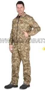 Описание: Куртка короткая, с отложным воротником, с центральной бортовой застежкой на тракторную молнию , с притачным поясом частично стянутым резинкой, с нагрудными карманами и клапанами на липучках, с боковыми карманами в вертикальных швах. Рукава, с манжетами на пуговицах.Брюки с притачным поясом, застёгивающимся на пуговицу, с 5 шлевками и эластичной тесьмой по боковым швам брюк, с застежкой гульфика на три петли и пуговицы, с двумя накладными боковыми карманами с наклонным входом.