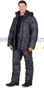 Костюм "Тайга" зимний состоит из удлиненной куртки и брюк.Куртка длинная прямого силуэта, с пристёгивающимся капюшоном, притачной утеплённой подкладкой, воротником стойкой, центральной застёжкой на "молнию", с ветрозащитной планкой, верхними и нижними накладными карманами. Рукава с напульсниками.Брюки прямые с притачной утеплённой подкладкой, притачным широким фигурным поясом, застёгивающимся на две петли и пуговицы, с застёжкой гульфика на молнию, двумя накладными боковыми карманами, с бретелями.