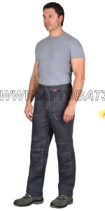 Брюки с застежкой спереди на однозамковую тесьму молния и на одну обметанную петлю и пуговицу на поясе; с различными многофункциональными карманами; обьемными наколенниками; с притачным поясом, частично стянутым резинкой по бокам.