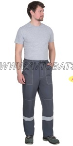 Брюки прямые, из антистатической ткани "Контакт 250А", с застёжкой гульфика на пуговицы, с притачным поясом, с частичной стяжкой по бокам на резинку, с внутренними боковыми карманами и наколенниками, с двумя задними накладными карманами и карманами для инструментов. В брюках предусмотрен СОП шириной 50 мм для обозначения сигнальной видимости.