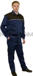 Куртка: супатная застежка на пуговицы; кокетка из отделочного материала на полочке и спинке; отложной воротник; полочка с одним нагрудным и двумя боковыми накладными карманами с клапанами; боковые карманы с цельнокроеными усилителями по низу; на поясе потайная кулиска; на спинке и груди под кокеткой светоотражающая лента. Брюки: притачной пояс; застежки на пуговицы.
