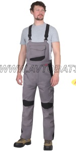Полукомбинезон прямой с застёжкой спереди - гульфик с молнией, с отрезной грудкой, отрезной спинкой, с бретелями. В боковом шве полукомбинезона со стороны задней половинки вставка из эластичного материала для удобства использования. Полукомбинезон с карманами спереди, сзади и на боковых швах, с объёмными наколенниками из полиэфирной, плотной, непромокаемой ткани с верхним входом для амортизационного вкладыша. Бретели регулируются по длине.