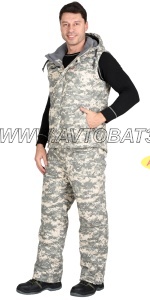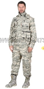 Ткань верха: "Рип - Стоп" состав: 65% п/э, 35% х/б, пл. 215г/м2. Цвет: КМФ "Пустыня"Ткань: "Флис", состав: 100% п/э, пл.180г/м2. Цвет: хаки.Утеплитель: Синтепон, состав: 100% п/э, один слой, пл.150г/м2. ГОСТ 25295-2003