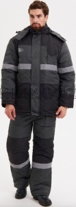 Минпромторг - Есть Костюм состоит из куртки и полукомбинезона. Куртка со светоотражающими полосами и кантом, с центральной застежкой на молнию, ветрозащитным клапаном на текстильную застёжку с чередованием кнопок и внутреннюю планку с уголком для защиты подбородочной части от молнии. Воротник стойка, с внутренней стороны флис, съёмный утеплённый капюшон. На правой полочке нагрудный карман для бейджа с прозрачной защитной плёнкой. Рукава с внутренними полушерстяными манжетами. Удлинённая по низу спинка. Внутренняя ветрозащитная юбка с застёжкой на кнопки. Полукомбинезон со светоотражающими полосами, с центральной застёжкой на молнию и планку с текстильными застёжками, на регулируемых по длине бретелях. На левой передней половинке нагрудный карман для сотового телефона. По низу брючин расположены разрезы на молниях с внутренними пуфтами для облегчения одевания на зимнюю обувь.